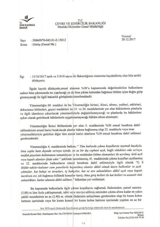 Emsal alanının %30′ u kapsamında değerlendirilen balkonların bina çıkmasında veya bina çıkma hattından bağımsız bölümiçine girip girmeyeceği hakkında bilgilendiren bakanlık görüşüdür.